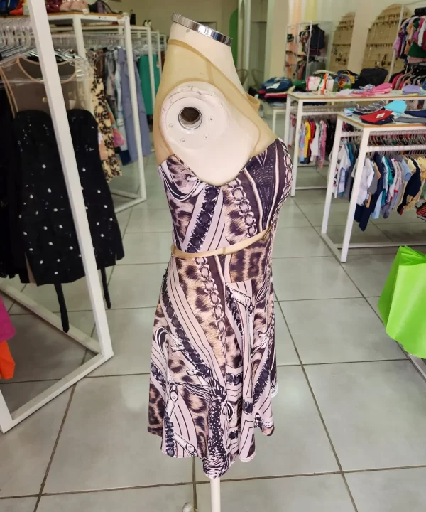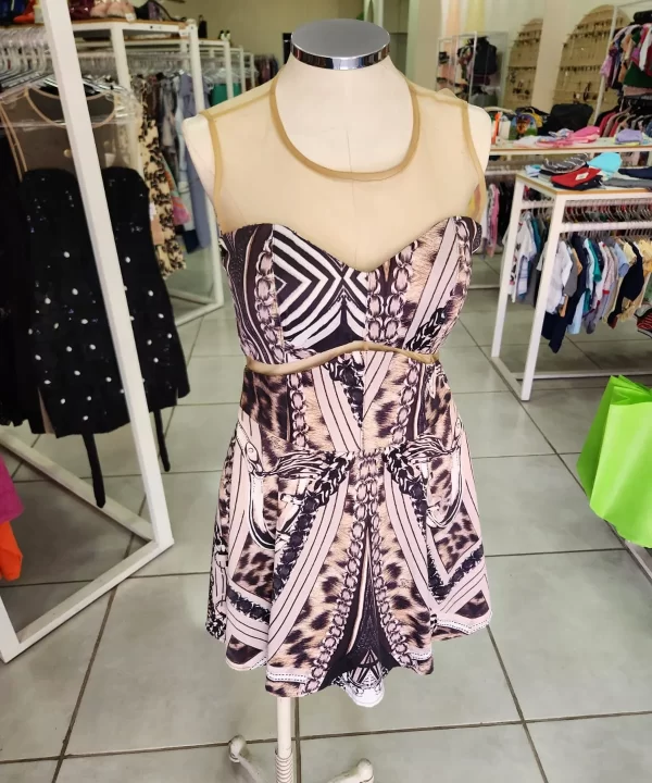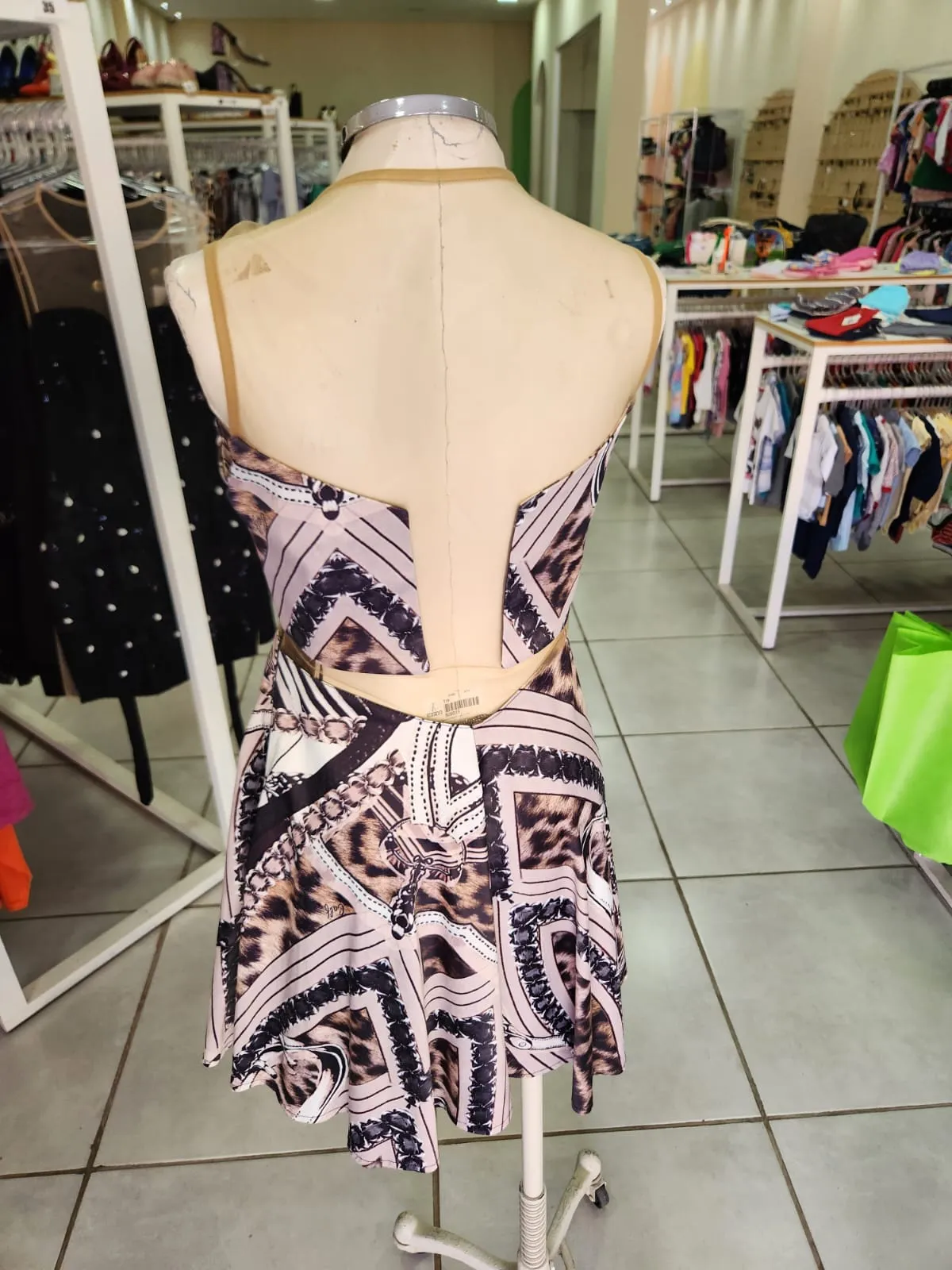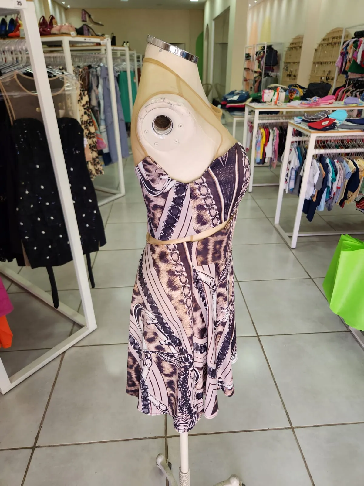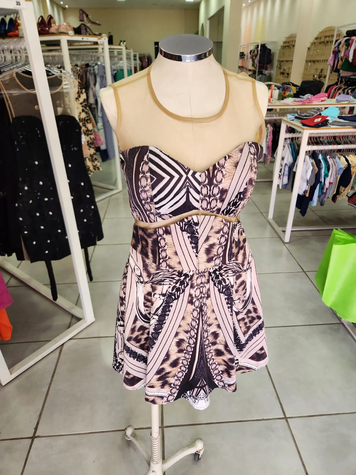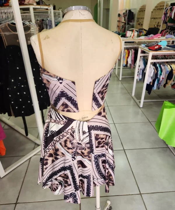 VESTIDO ACETINADO COM ESTAMPA DE ONÇA COM CORRENTE TULE BEGE NA PARTE SUPERIOR- CALF