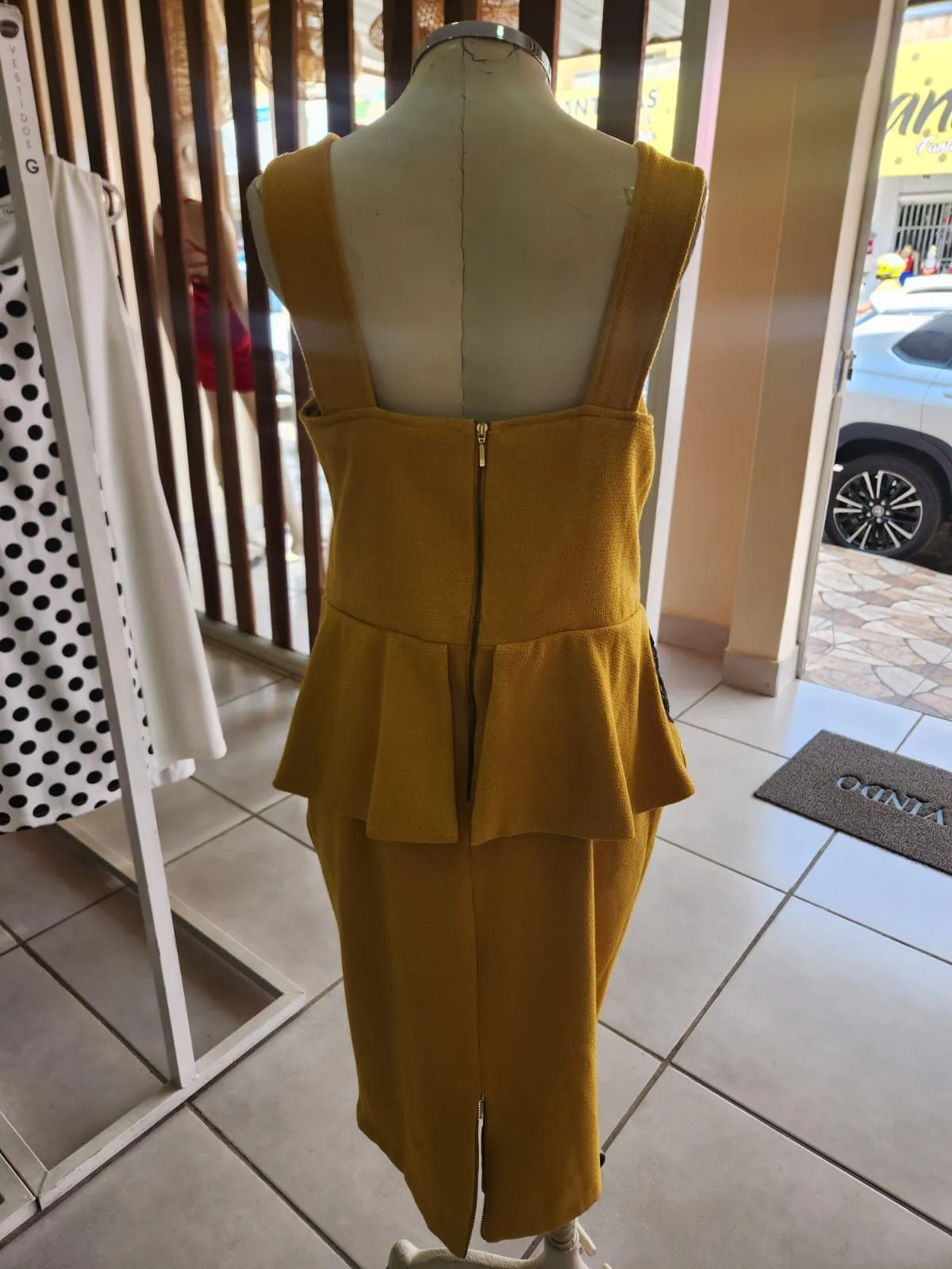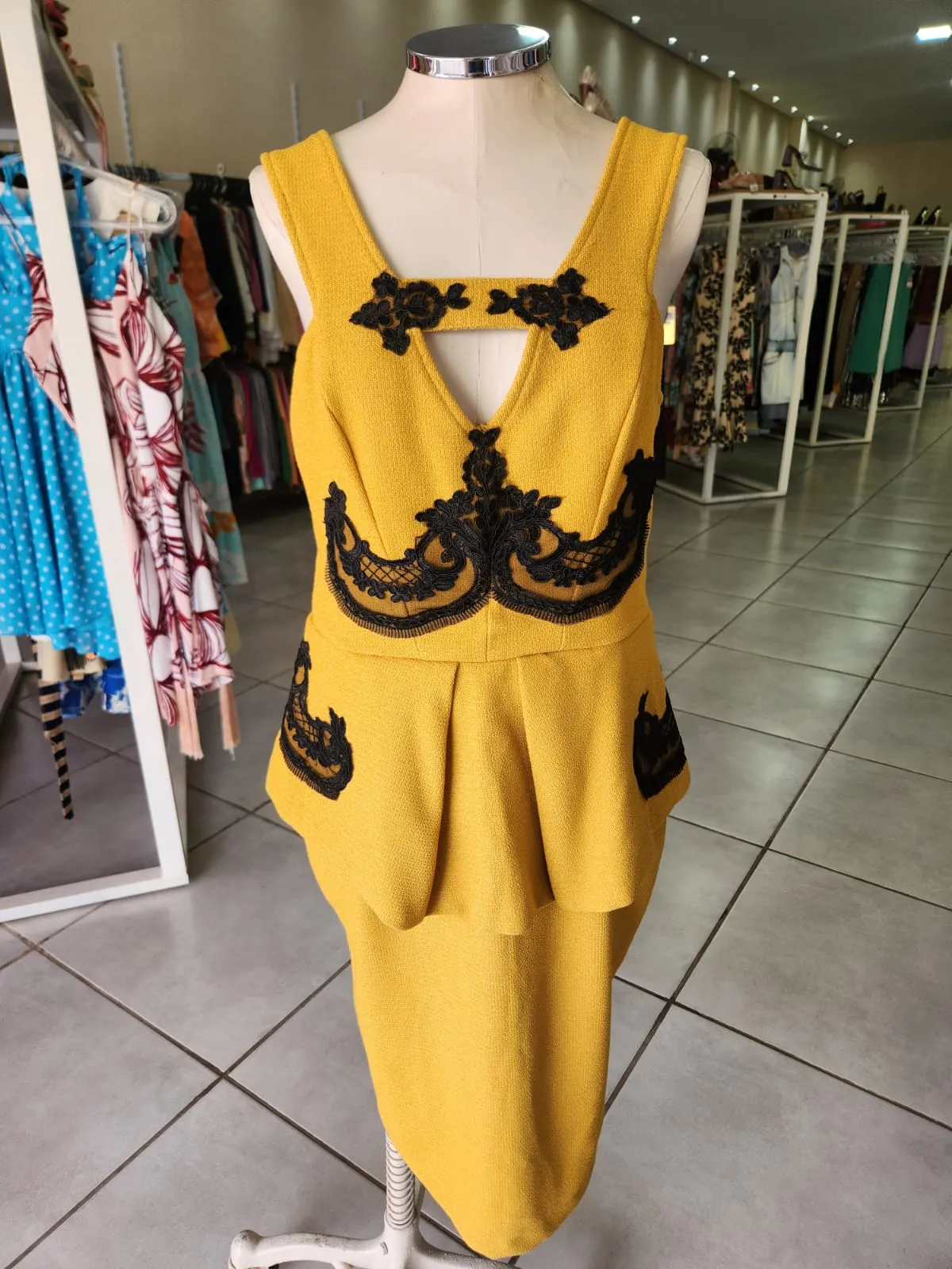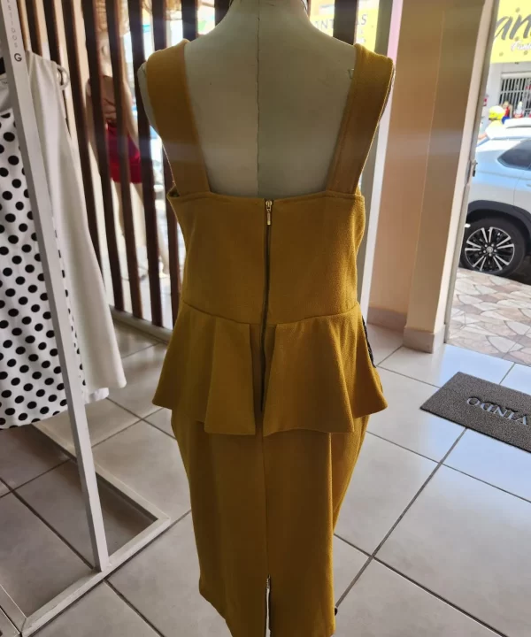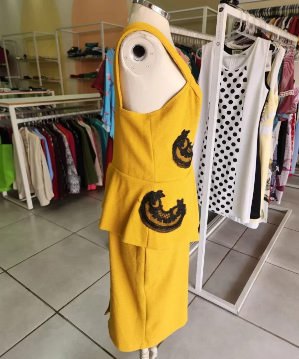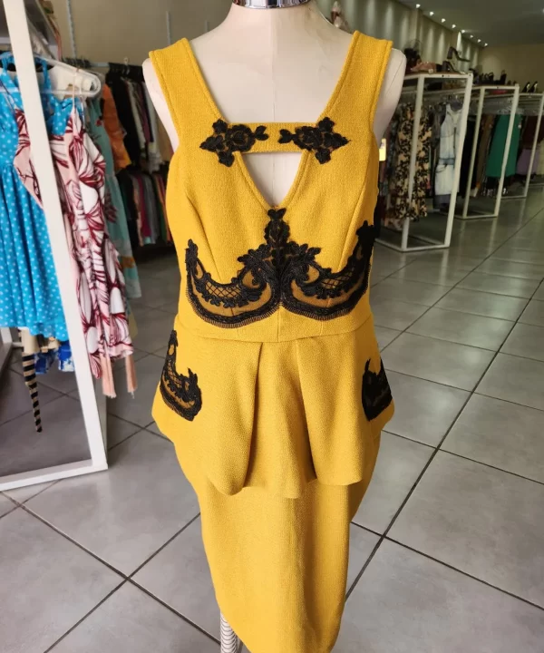 VESTIDO DE LINHÃO MOSTARDA COM RENDA PRETA E CINTURA PEPLUM- SCLUB