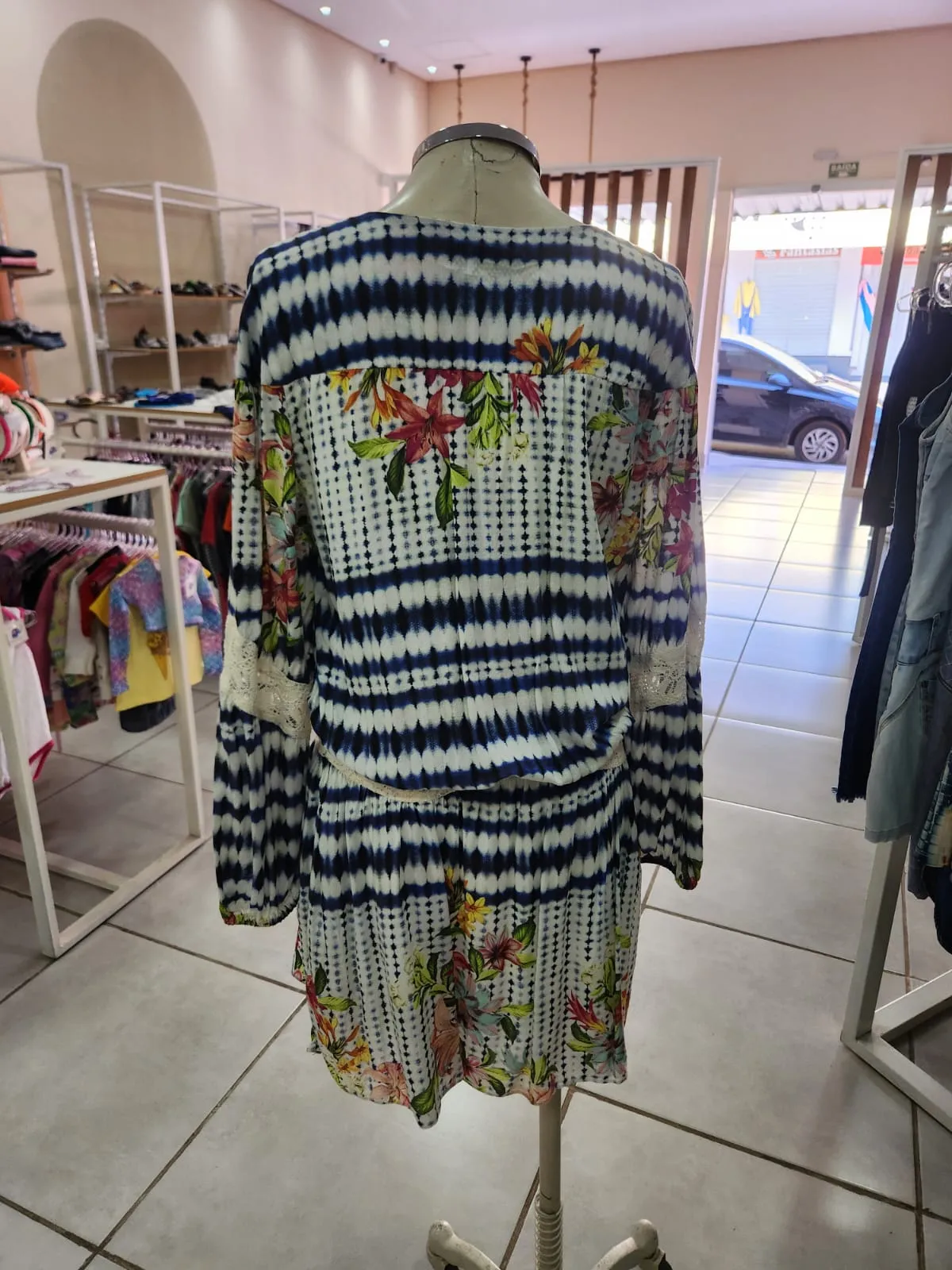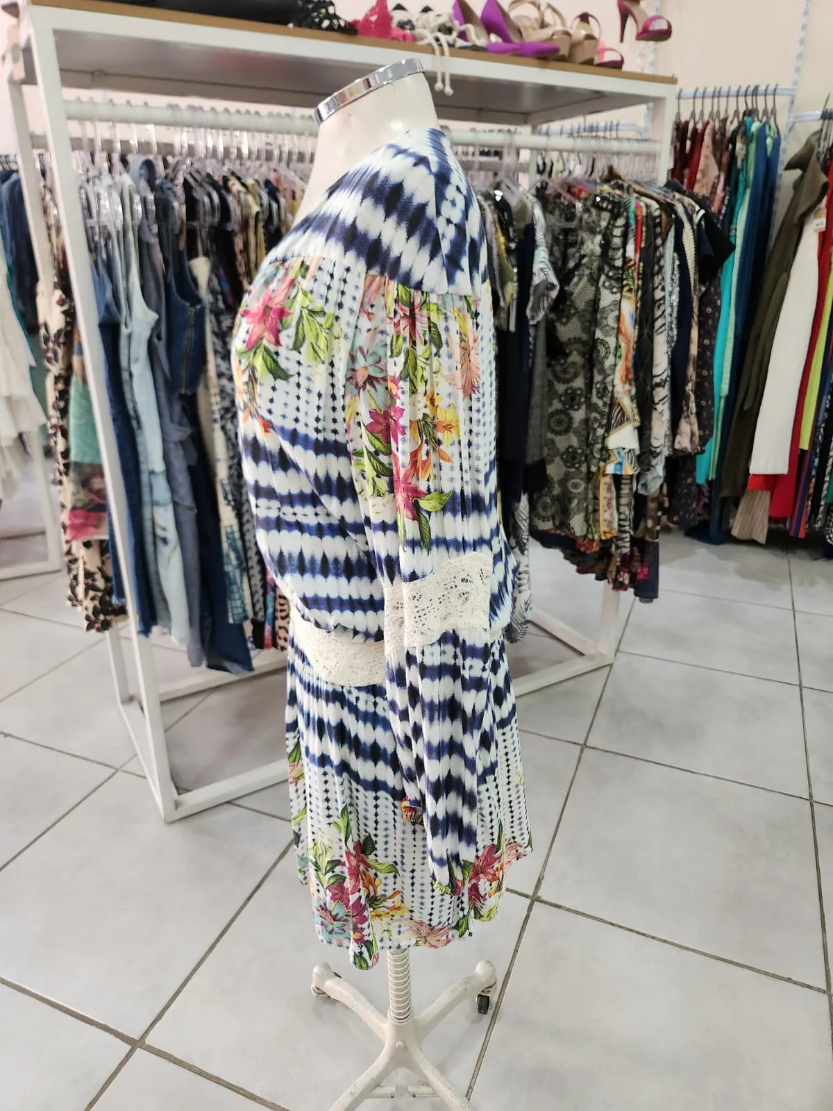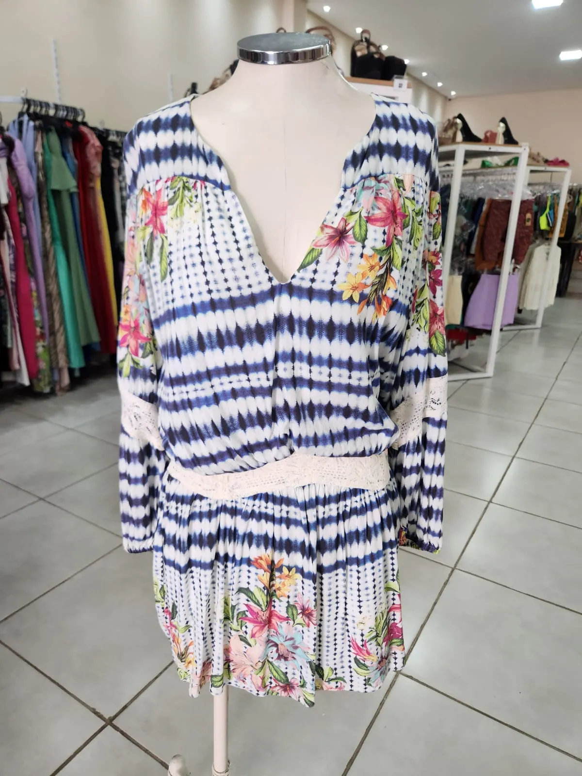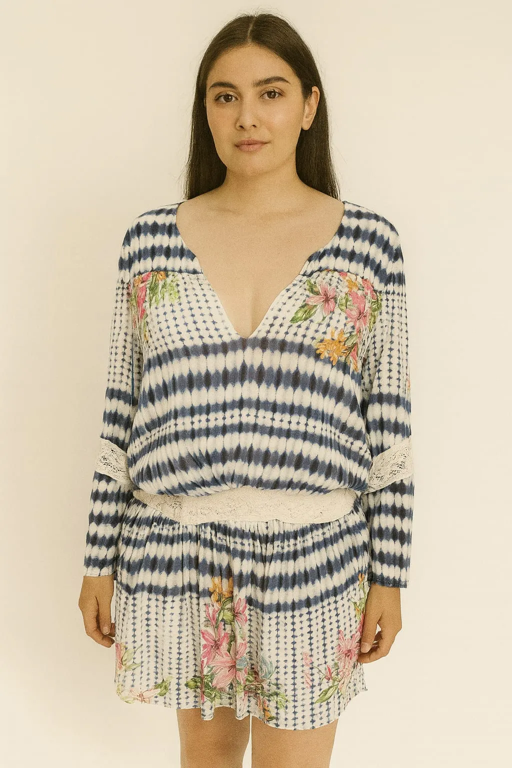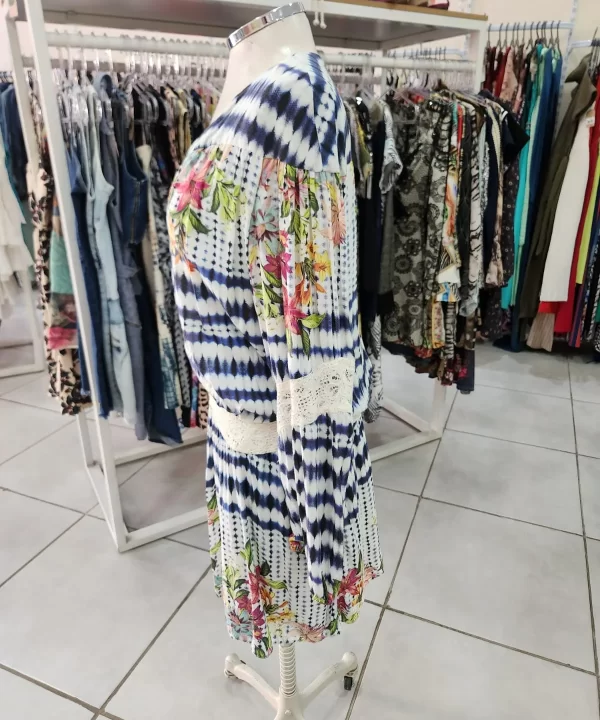 VESTIDO MANGA LONGA AZUL E BRANCO RENDA NA BARRIGA ESTAMPA DE LIRIOS – DRESS TO