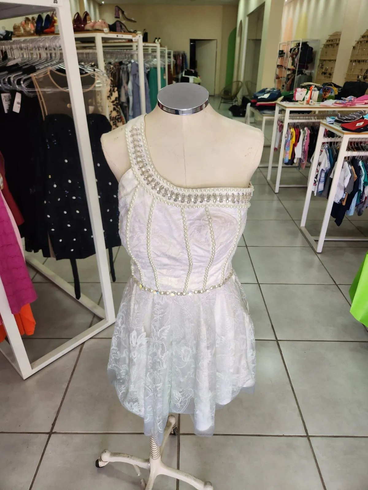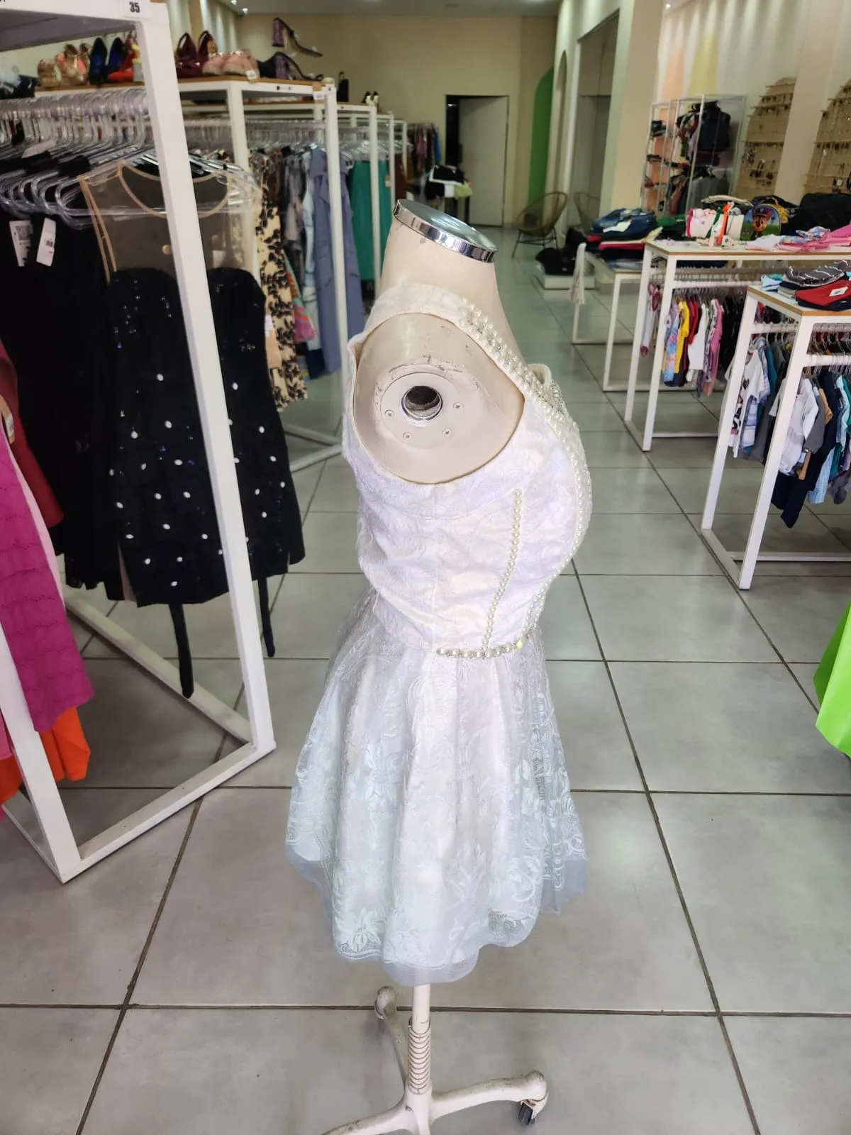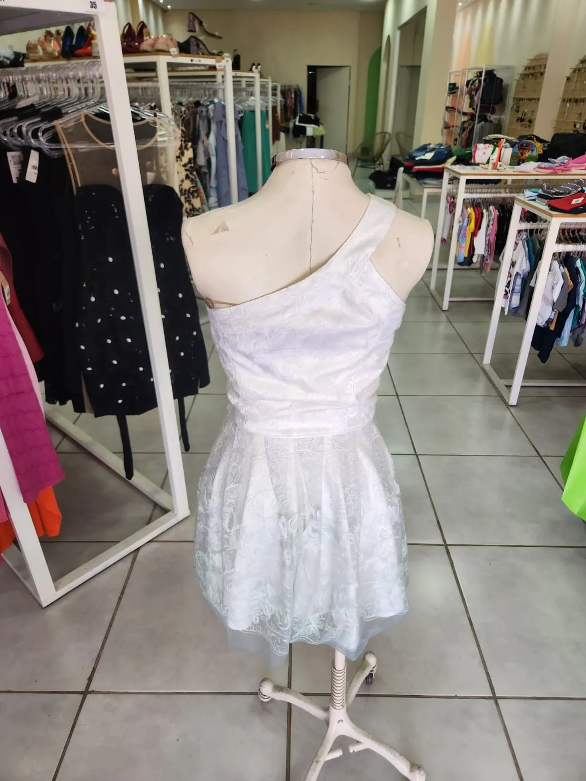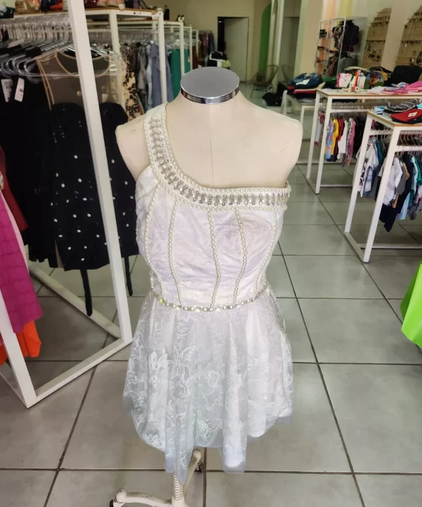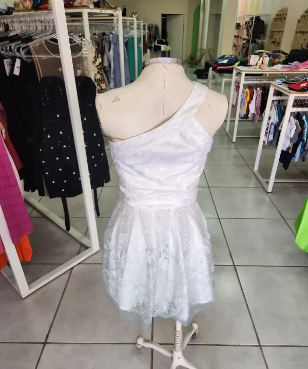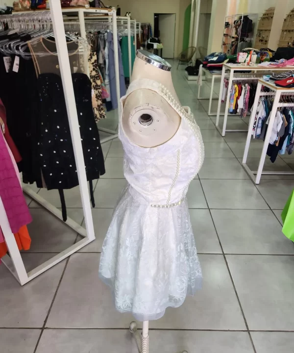 -VESTIDO NULA MANGA, DE RENDA BRANCO COM DEGRADÊ NA BARRA VERDE ÁGUA-PERFECT WAY