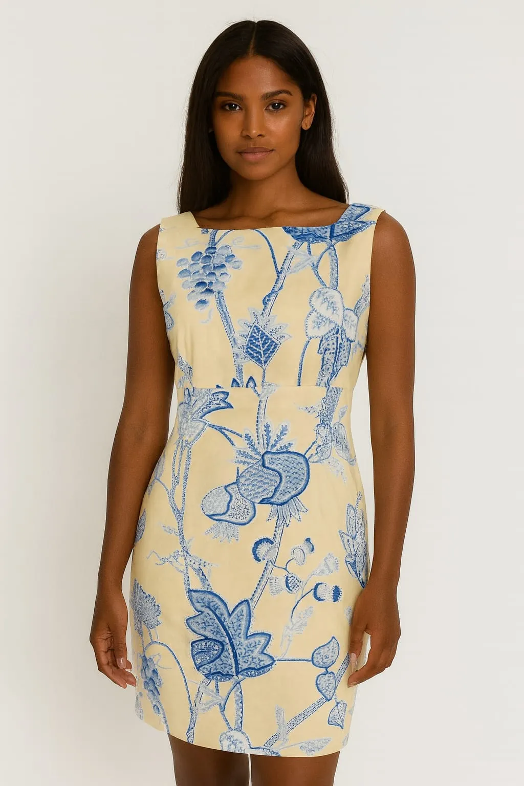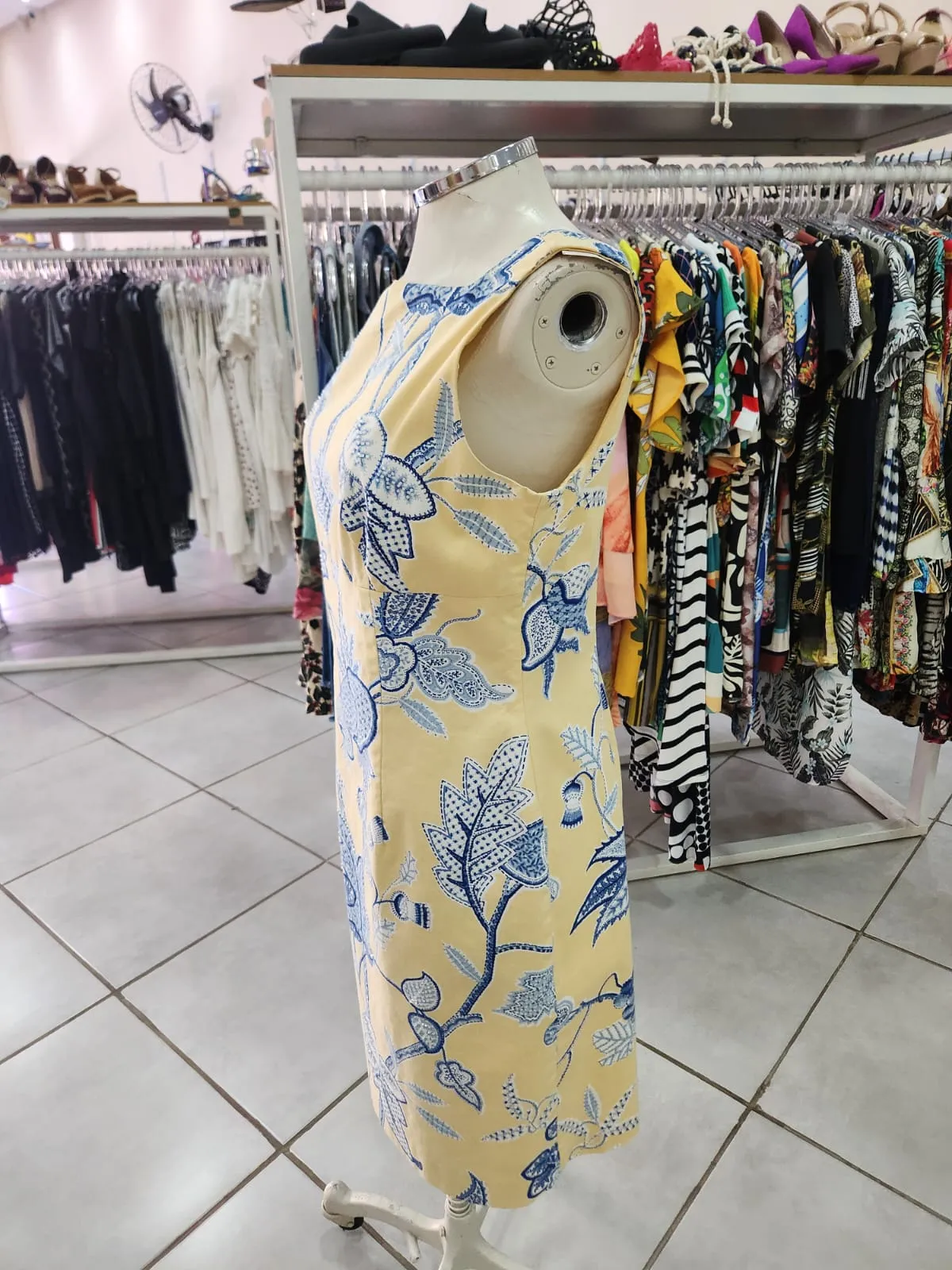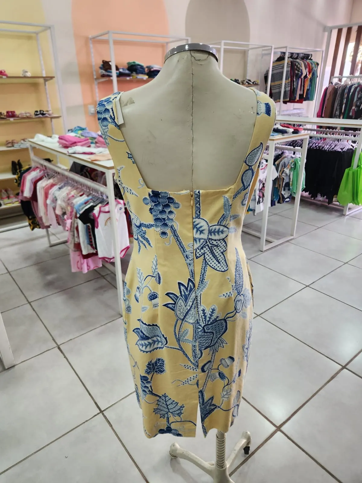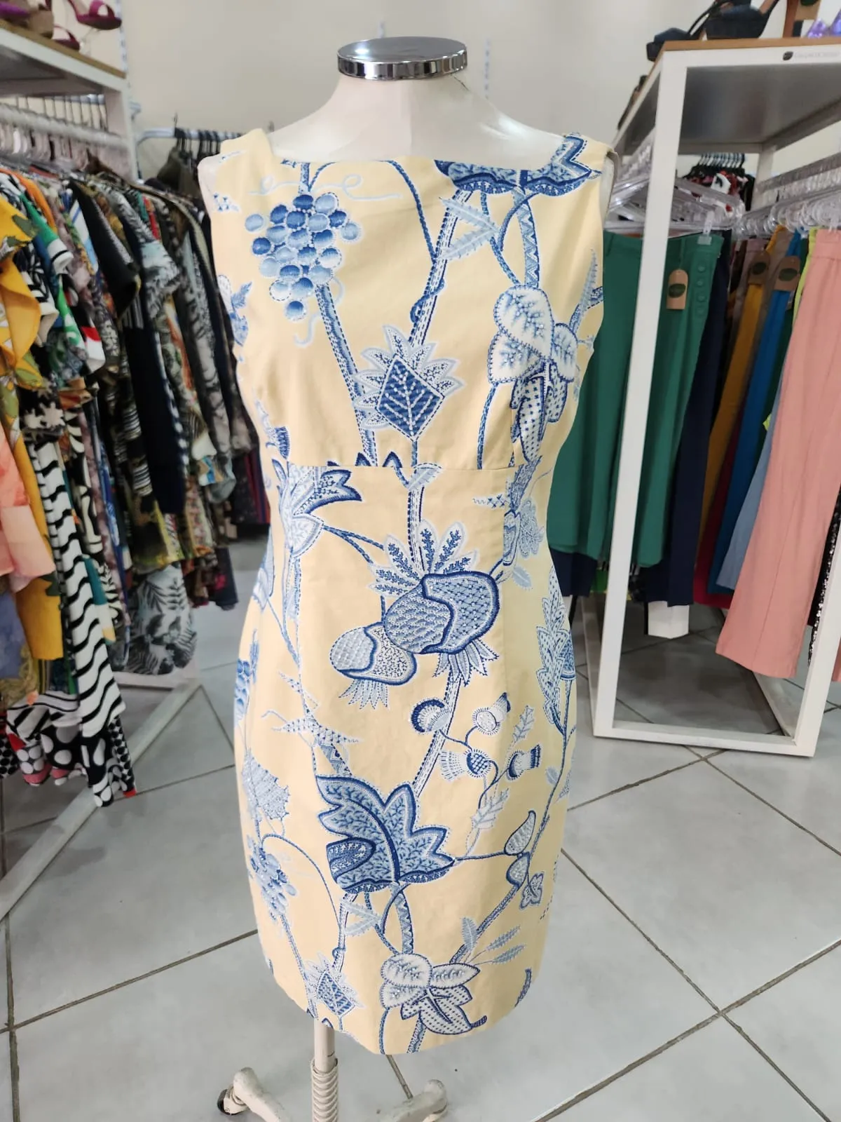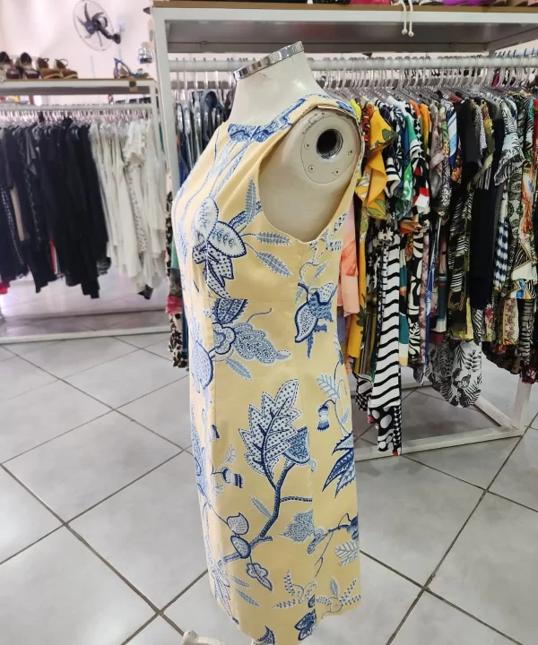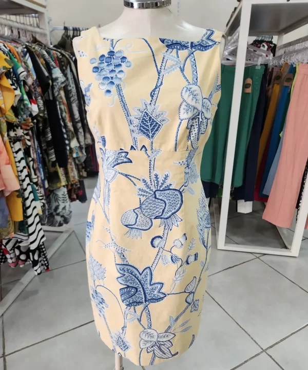 VESTIDO SOCIAL AMARELO ESTAMPA FLORAL AZUL COM MIÇANGAS ZIPER NAS COSTAS- MAGGY LONDON