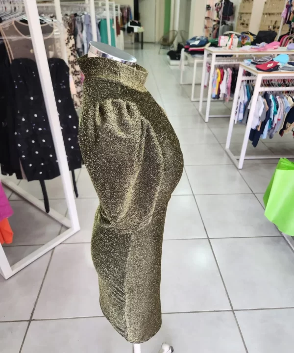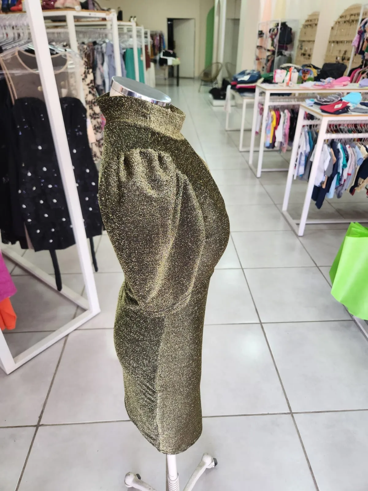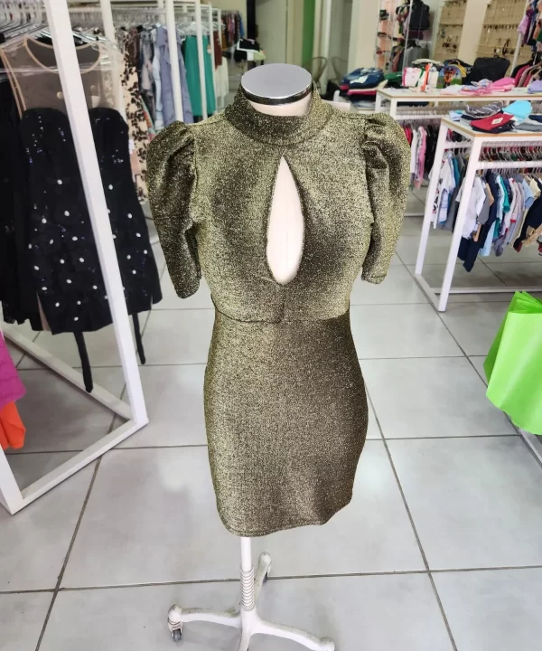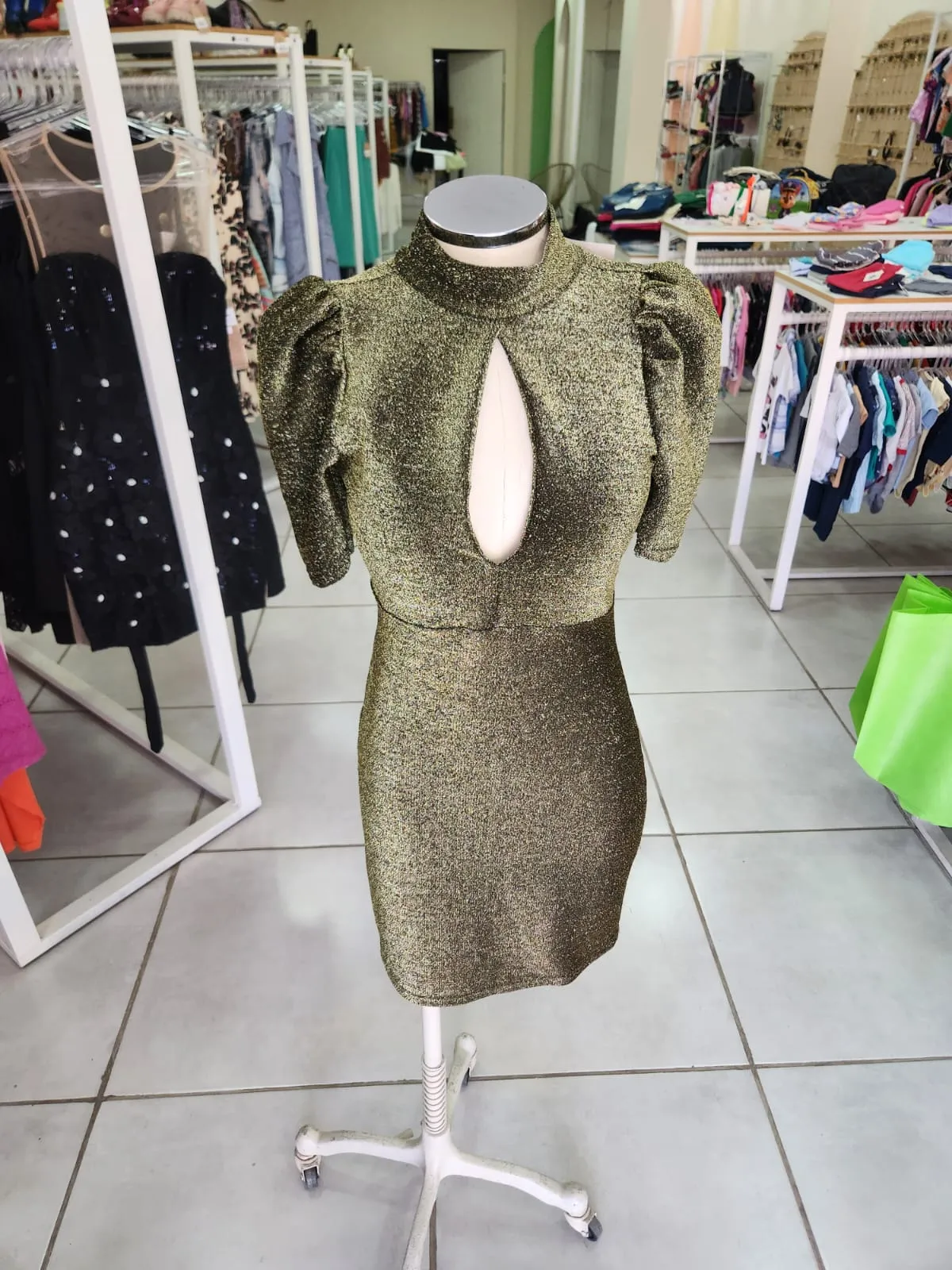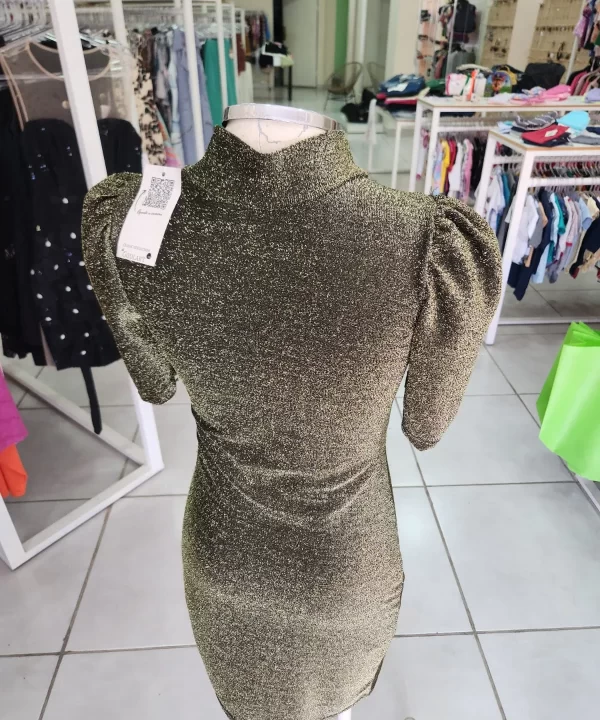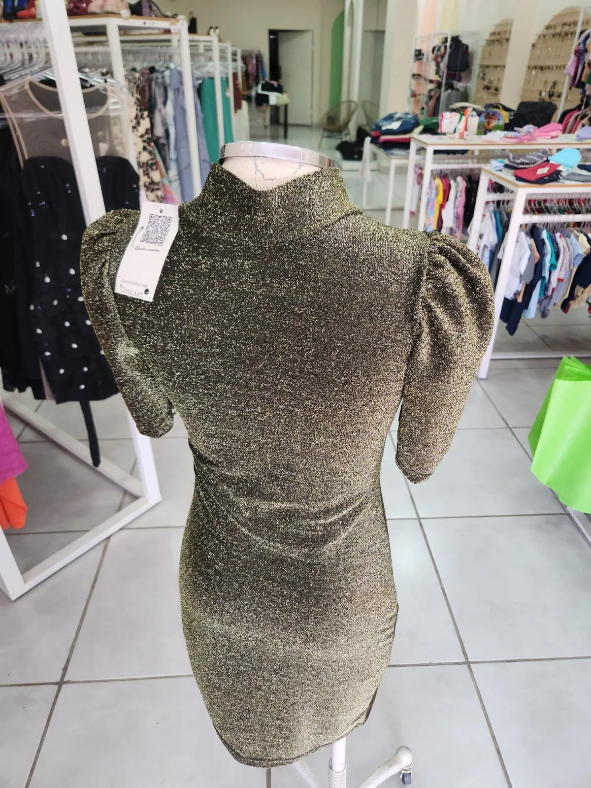 VESTIDO TUBINHO DE LUREX GOLA ALTA MANGA CURTA DECOTE EM GOTA DOURADO COM FUNDO PRETO